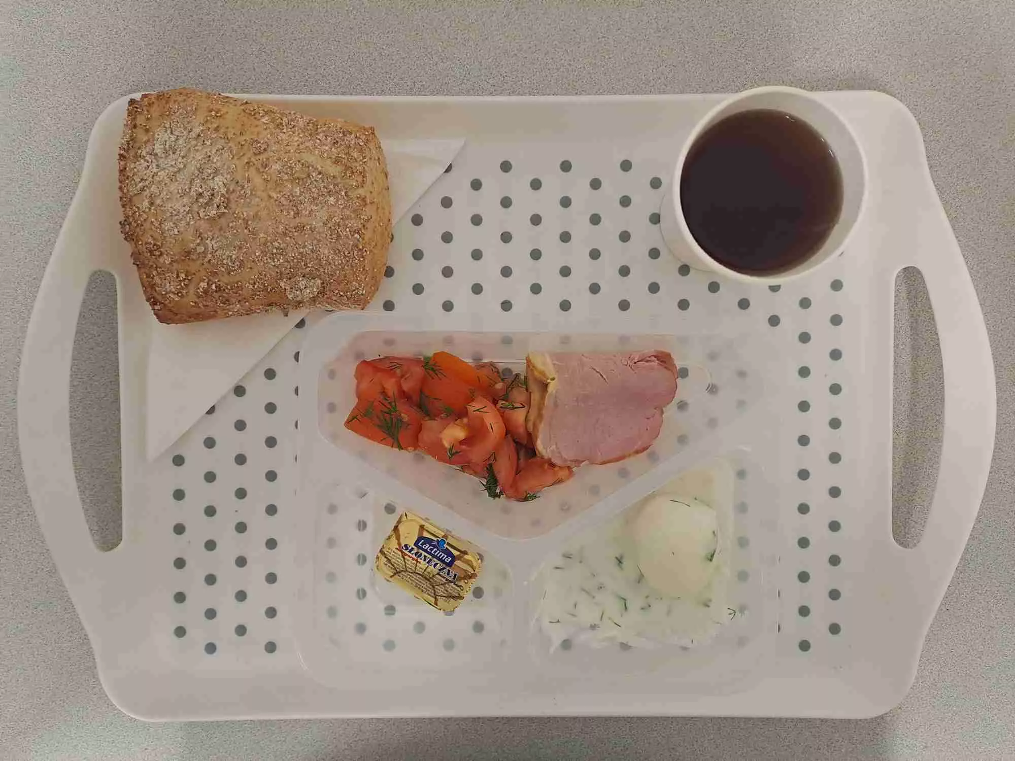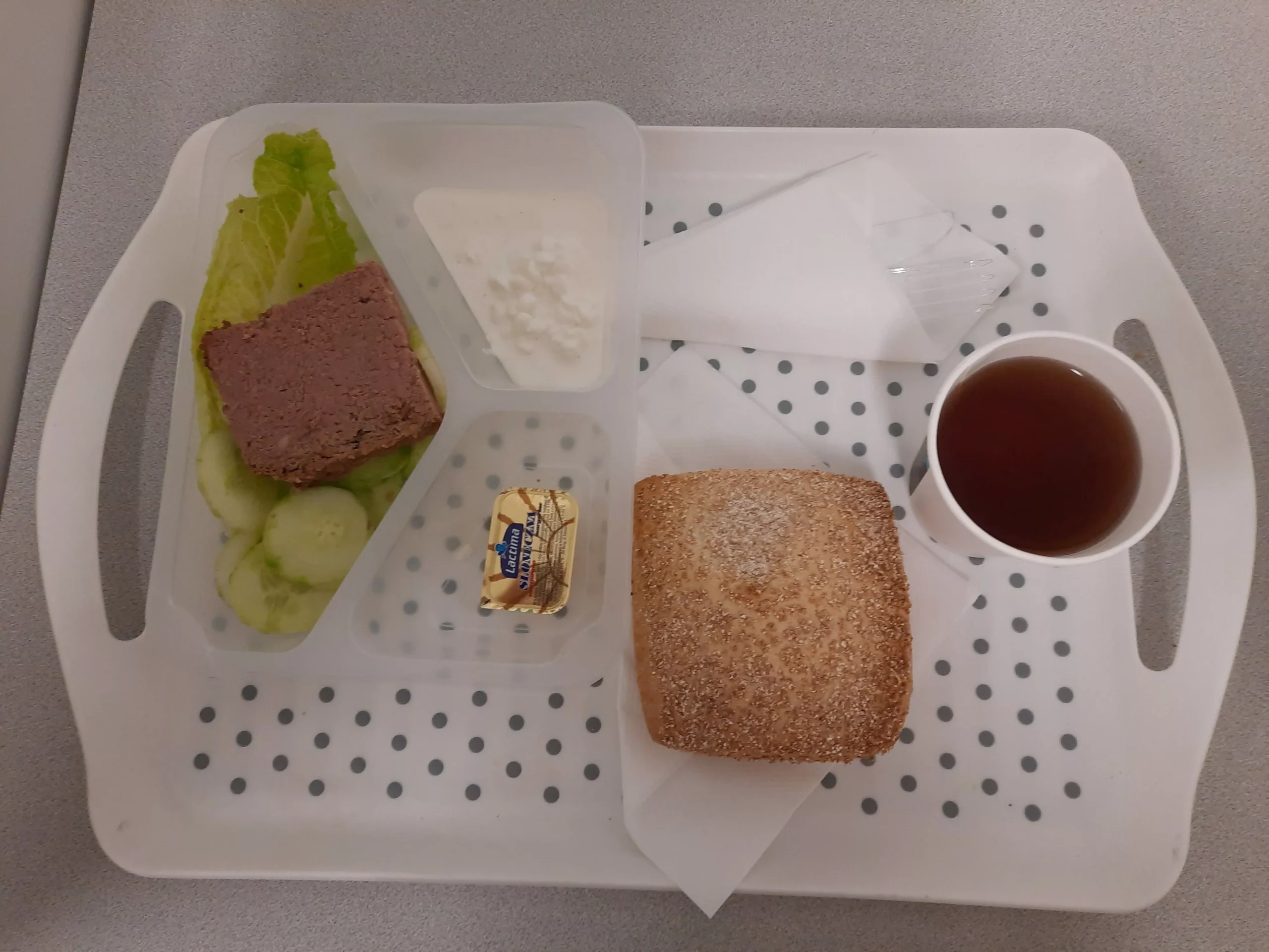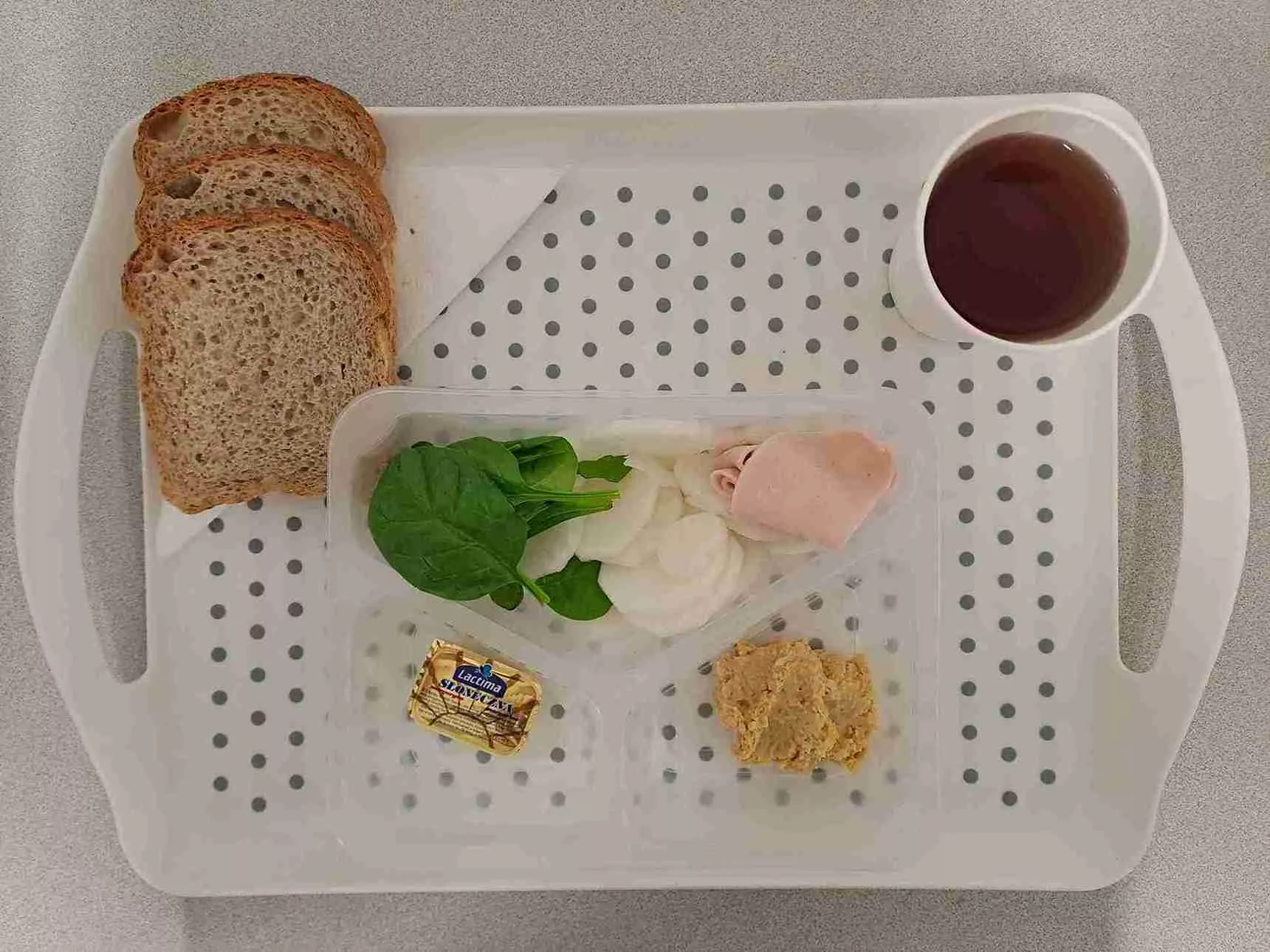 Śniadanie: dieta podstawowa herbata czarna b/c -250ml, chleb graham-70g (sezam, gluten), chleb pszenny - 30g (gluten) margaryna 60 % tł. 10 g, pasztet drobiowy 40g (seler, gluten, jaja), pasta z twarogu i papryki 40 g (mleko), szpinak liście 10 g, ogórek konserwowy 80 g (gorczyca)