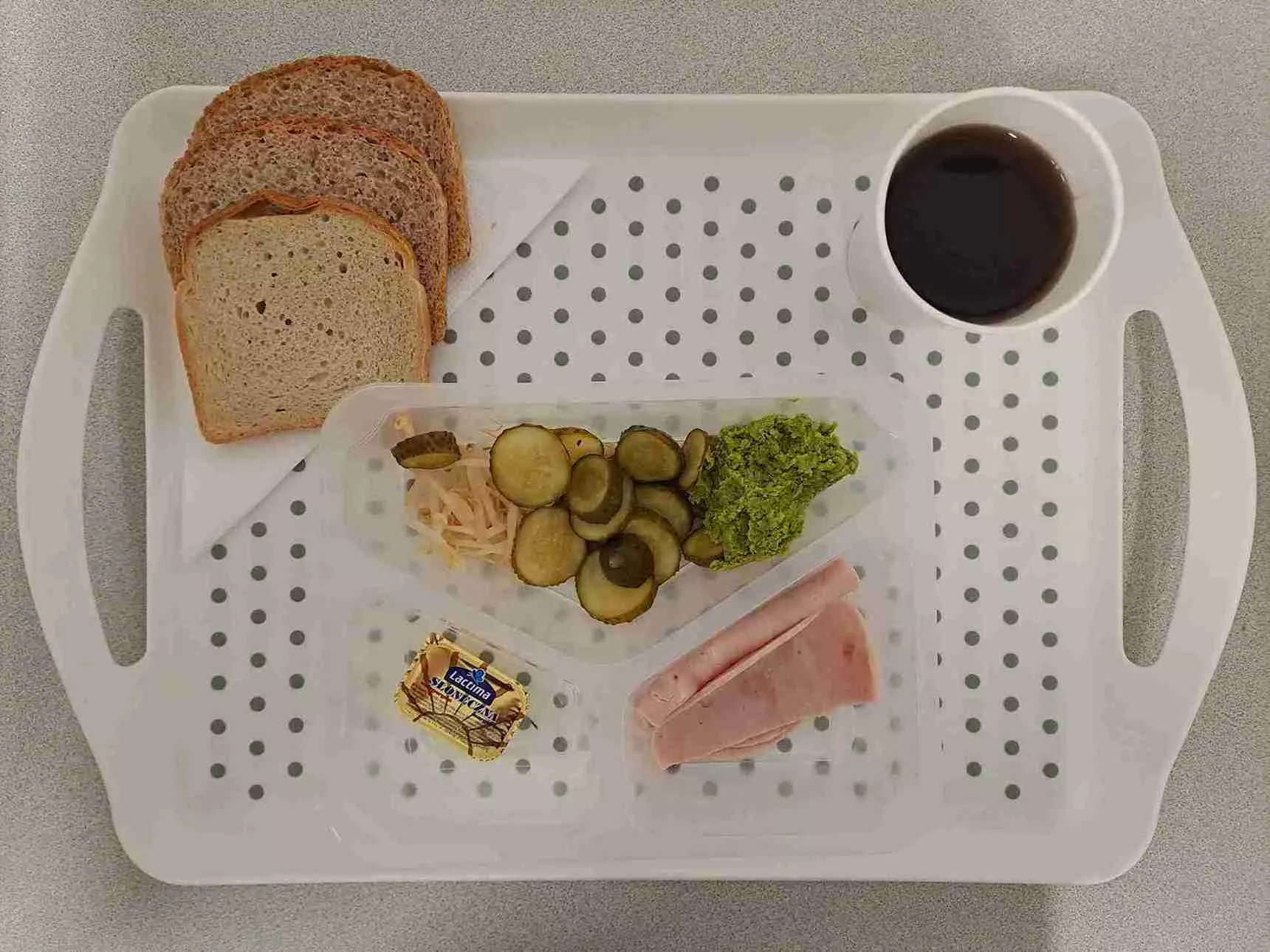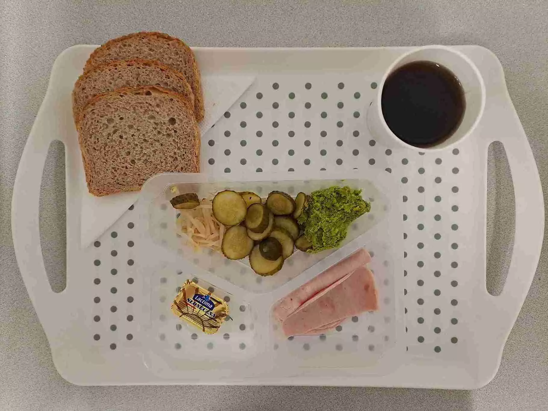 Śniadanie, dieta podstawowa: herbata czarna b/c - 250ml, chleb graham - 70g (sezam, gluten), chleb pszenny- 30g (gluten), margaryna 60 % tł. 10 g, szynka z indyka 40g (soja), pasta z twarogu i papryki 40 g (mleko), szpinak liście 10 g, ogórek konserwowy 80 g (gorczyca)