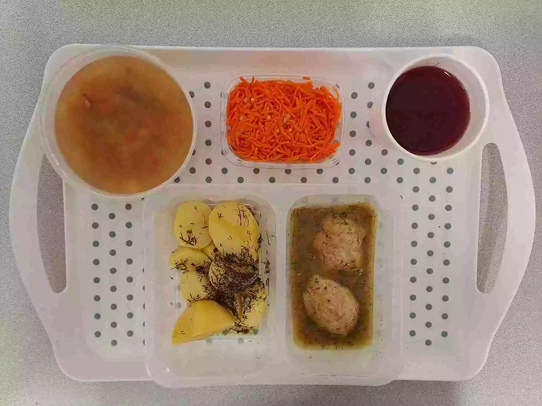 Obiad: dieta podstawowa kompot owocowy b/c 250 ml, zupa wielowarzywna z kaszą pęczak 400ml (seler, gluten, mleko), klopsiki drobiowe gotowane 80 g (gluten, jaja, mleko), sos koperkowy 50 ml (gluten, mleko), ziemniaki gotowane 200 g, surówka z marchwi i jabłka 150 g